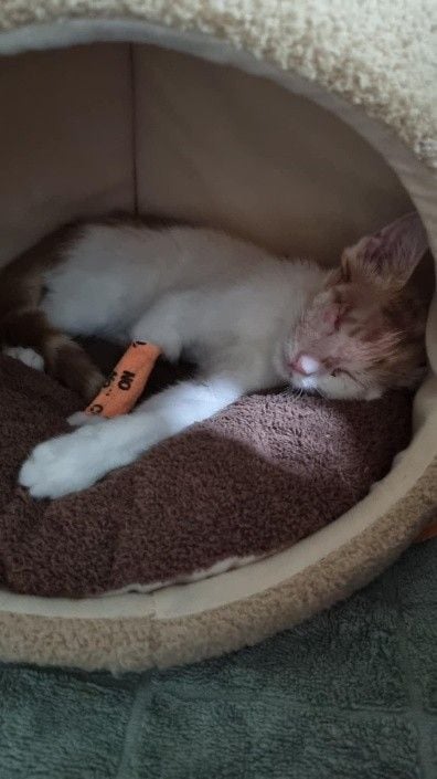 This is Sid. He is a very sweet 13-week-old domestic short haired kitty who has already gone through a great deal in his short time alive. Sid’s owners rescued him with one swollen eye and one eye a bit squinty with discharge out of both eyes, sneezing and not being as playful and lively as a normal kitten would be. They took him to us, to get him checked out and found out what was going on. Dr Hilary concluded from patient history and clinical signs that poor Sid had cat flu and a ruptured eye globe (eyeball) from the result of the medications such as antibiotics and eye ointment (for the other eye) was the best option for him.